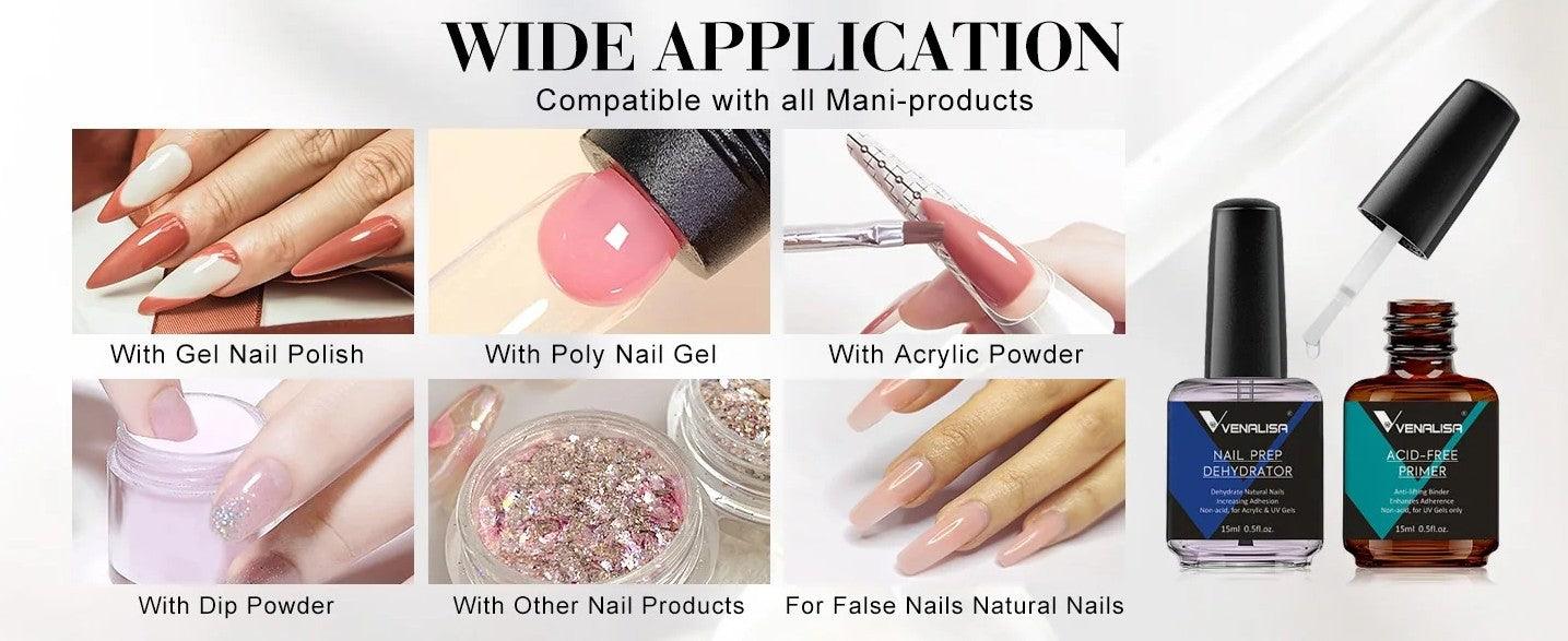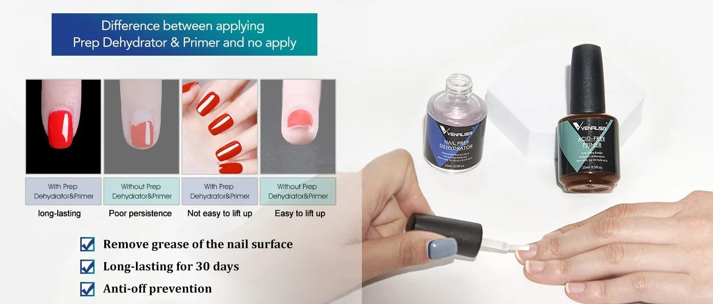 Dehydrator poistaa öljyn ja kosteuden kynsilevyltä, kun taas happovapaa primer toimii kuin kaksipuolinen teippi, joka sitoo luonnonkynnen ja tuotteen toisiinsa. Yhdessä käytettynä ne tarjoavat kaksinkertaisen suojan irtoamista vastaan.